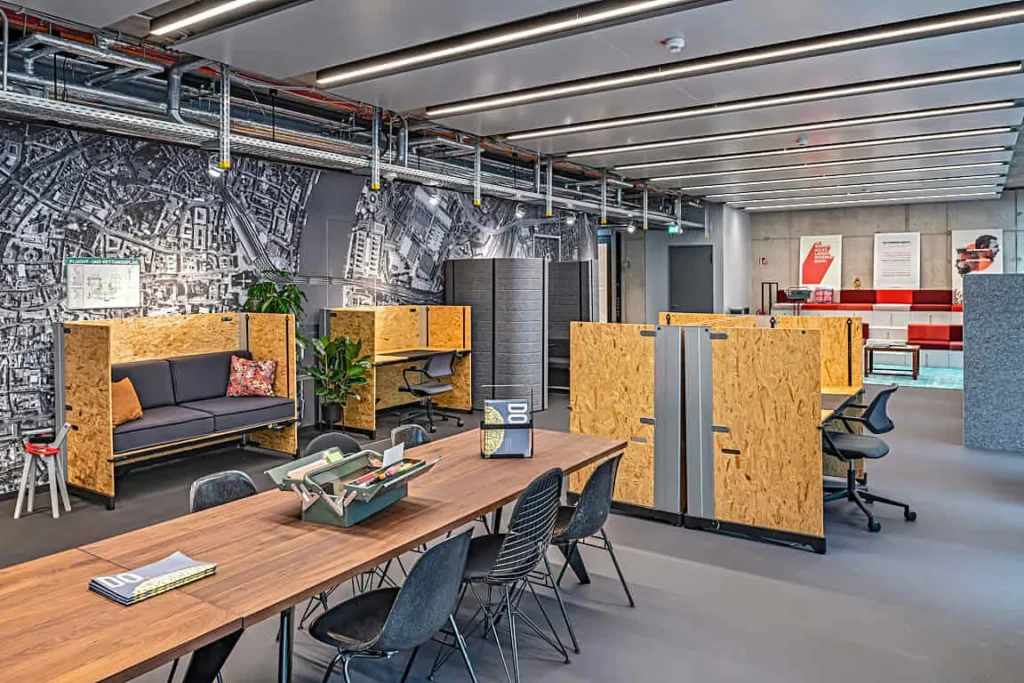 Estações de trabalho em um ambiente colaborativo, ideal para networking e troca de ideias entre profissionais de diferentes áreas.